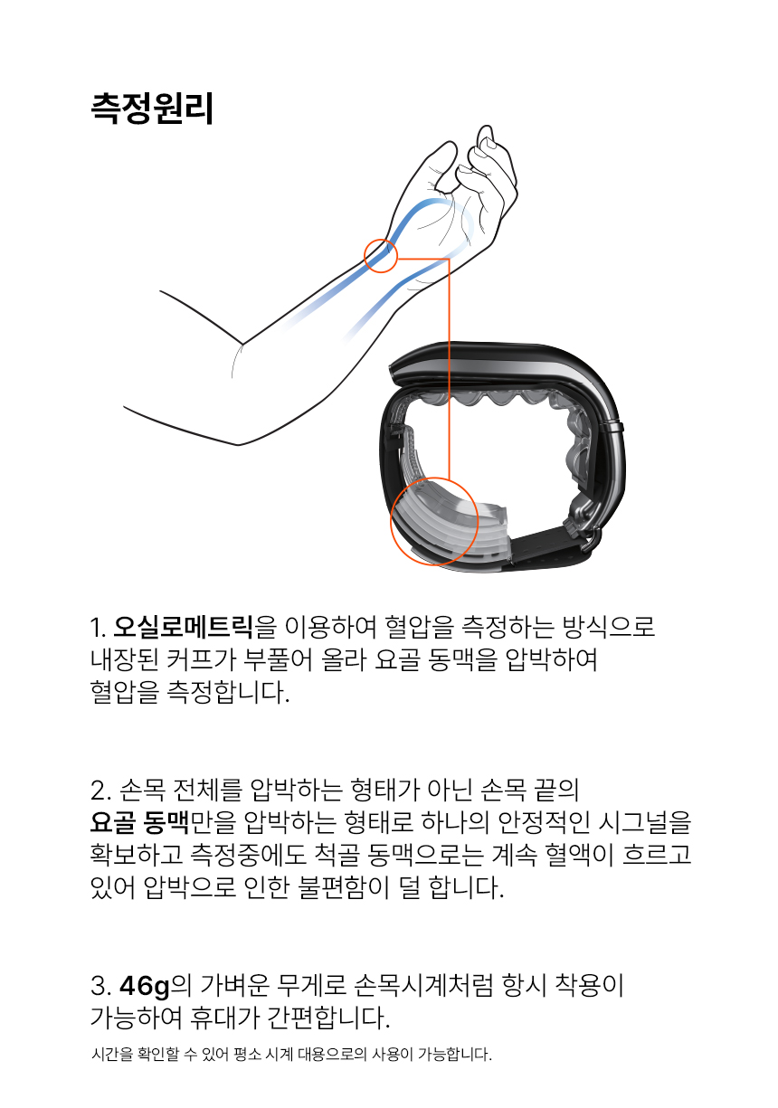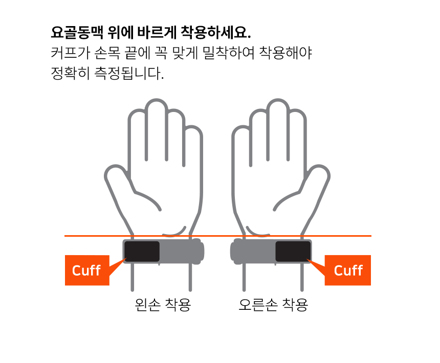요골동맥 위에 바르게 착용하세요.
