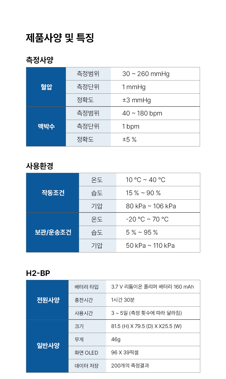 오실로메트릭 방식을 이용한 휴대용 혈압감시기로 성인의 수축기 및 확장기 혈압을 비침습적으로 측정합니다.